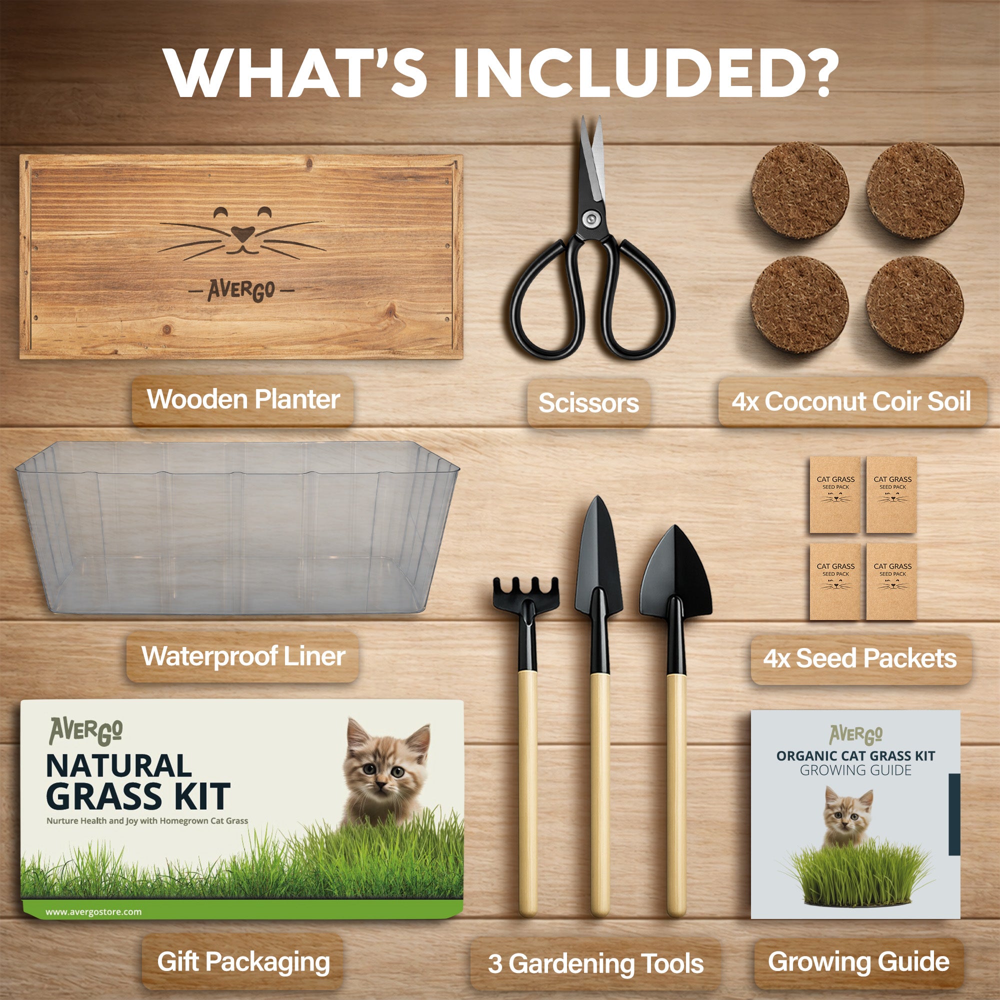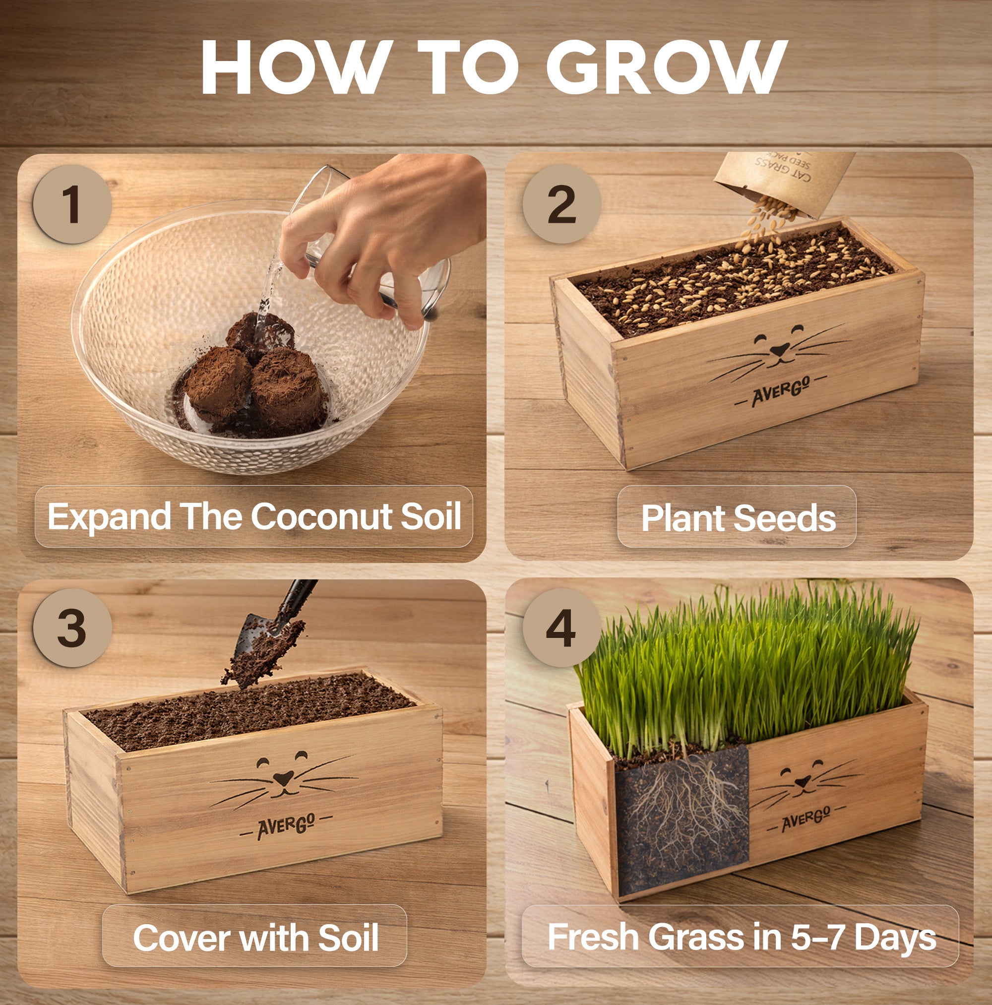 - Complete Kit: Cat grass kit includes cat grass seeds, coconut coir soil discs, wooden cat grass planter, and mini tools.